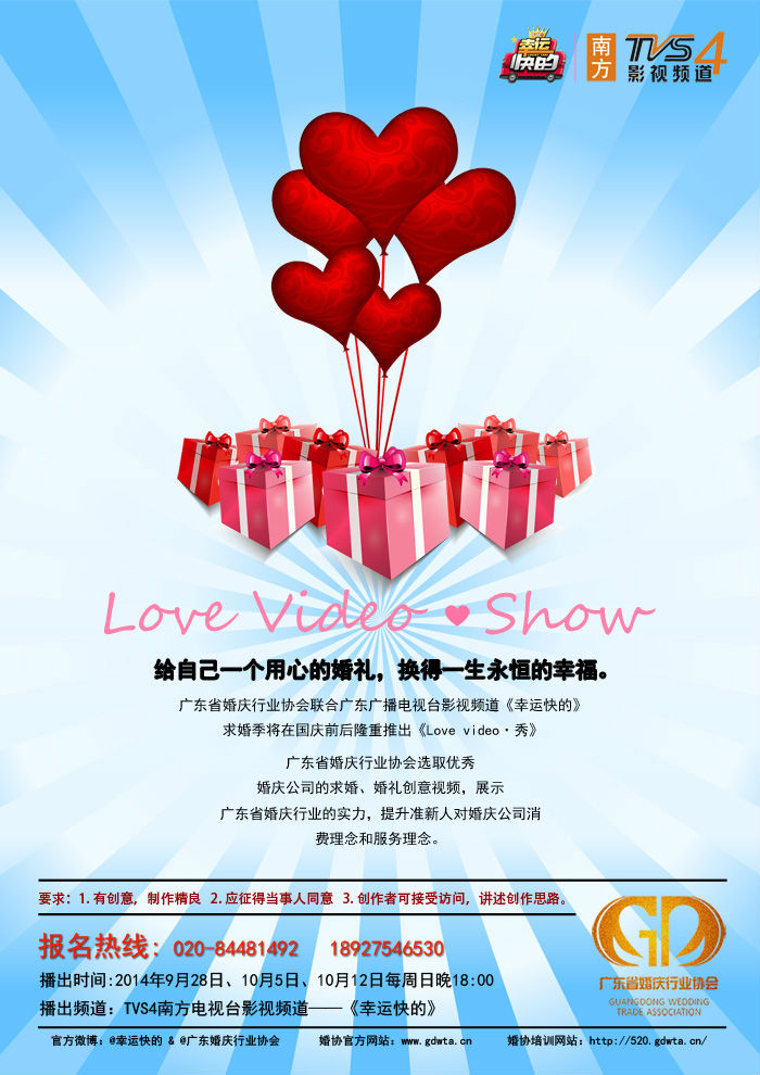 广东省婚庆行业协会将联合南方电视台影视频道《幸运快的》现征集会员单位以上优秀婚礼创意视频,为准新人排忧解难,增强广东省婚庆行业会员单位知名度与影响力。同时让更多新人了解岭南婚礼人文化底蕴,让新人更好了解婚庆市场。提升广东省市民的婚庆观念,展示婚庆美的一面,同时展示广东省各婚庆公司的实力,特征集创意视频。求婚季(创意视频)将于国庆前后在南方电视台影视频道《幸运快的》栏目中与广东婚协官方网站特别展播。?