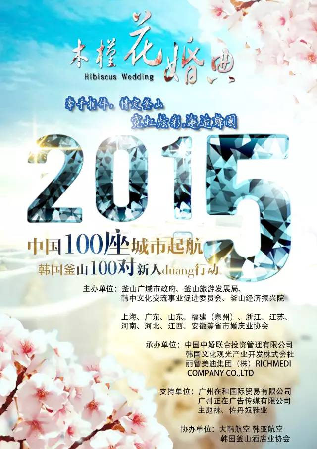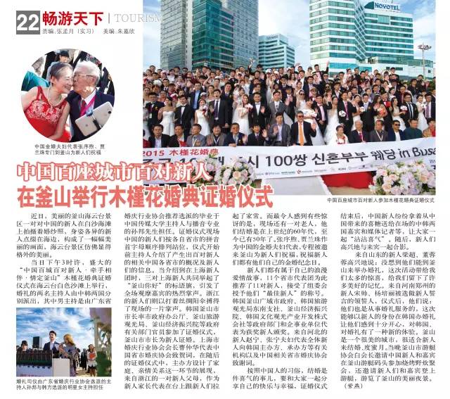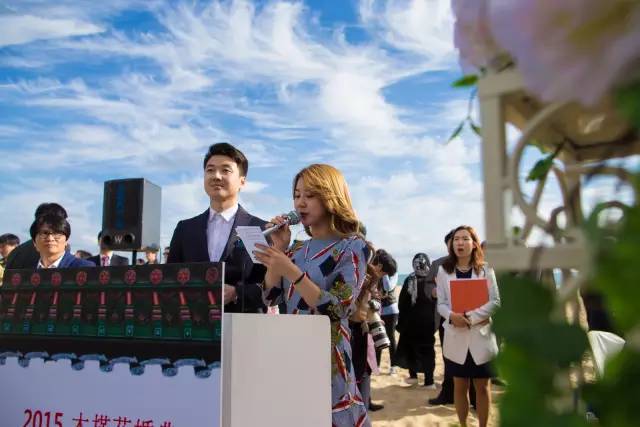 下午3时许,来自中国百城百对新人牵手相恋,情定釜山的木槿花婚典盛大的证婚仪式在海云台白色沙滩上举行,两名婚礼主持人由中韩两国分别派出,其中男主持是由广东省婚庆行业协会推荐选派的毕业于中国传媒大学主持人与播音专业的孙邦先生担任。