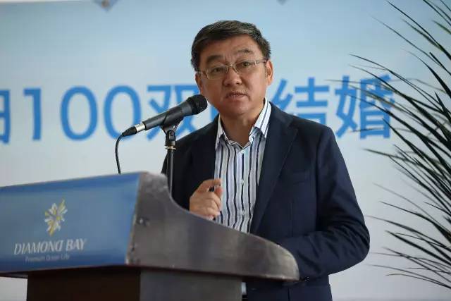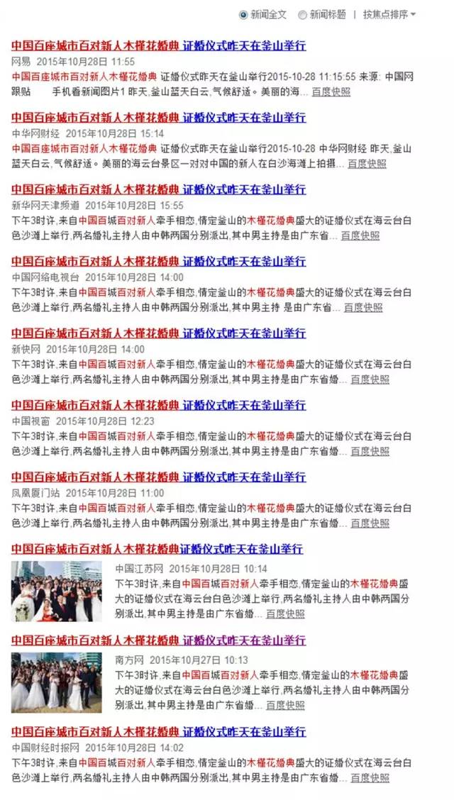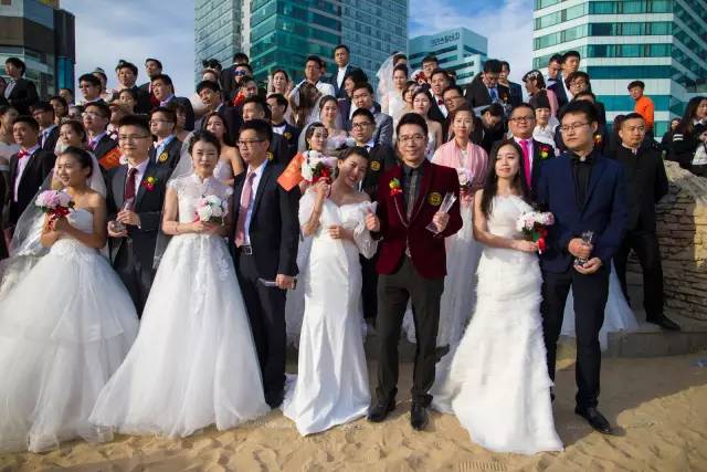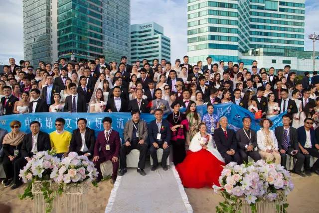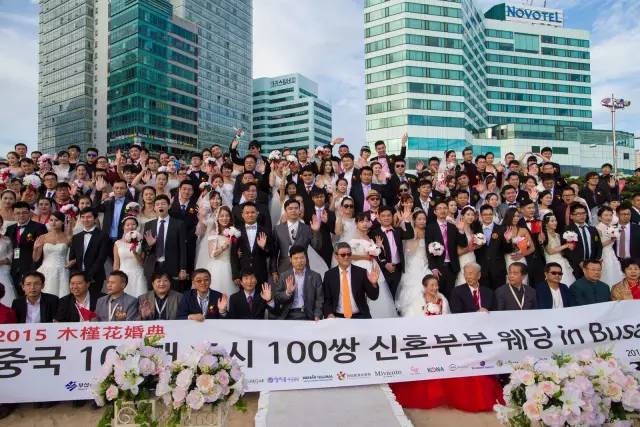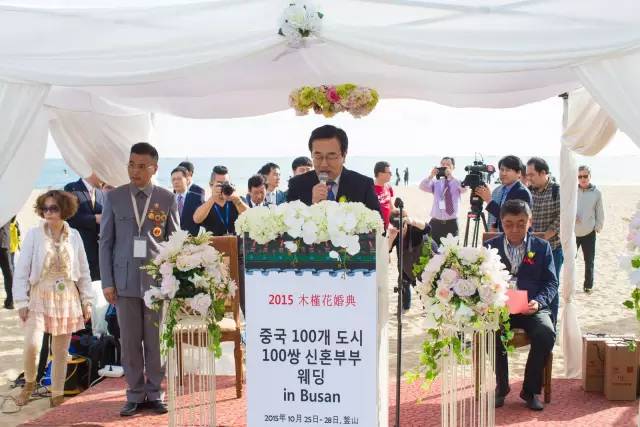 证婚仪式现场中国的新人们按各自省市的拼音首字母顺序排列站位,仪式开始前主持人介绍了产生出百对新人的相关中国各省市的概况及新人们的信息。介绍到在上海新人团时,三对上海新人共同举起了“釜山你好”的标语旗时,引发了全场观摩嘉宾的热烈掌声。浙江的新人们则以打着丝绸阳伞搏的了现场的一片掌声,韩国釜山市市长率市政府办公厅、釜山旅游观光局、釜山经济振兴院等政府有关部门官员参加了证婚仪式,釜山市市长为新人证婚。上海市婚庆行业协会会长曹仲华代表中国省市婚庆协会致贺词。