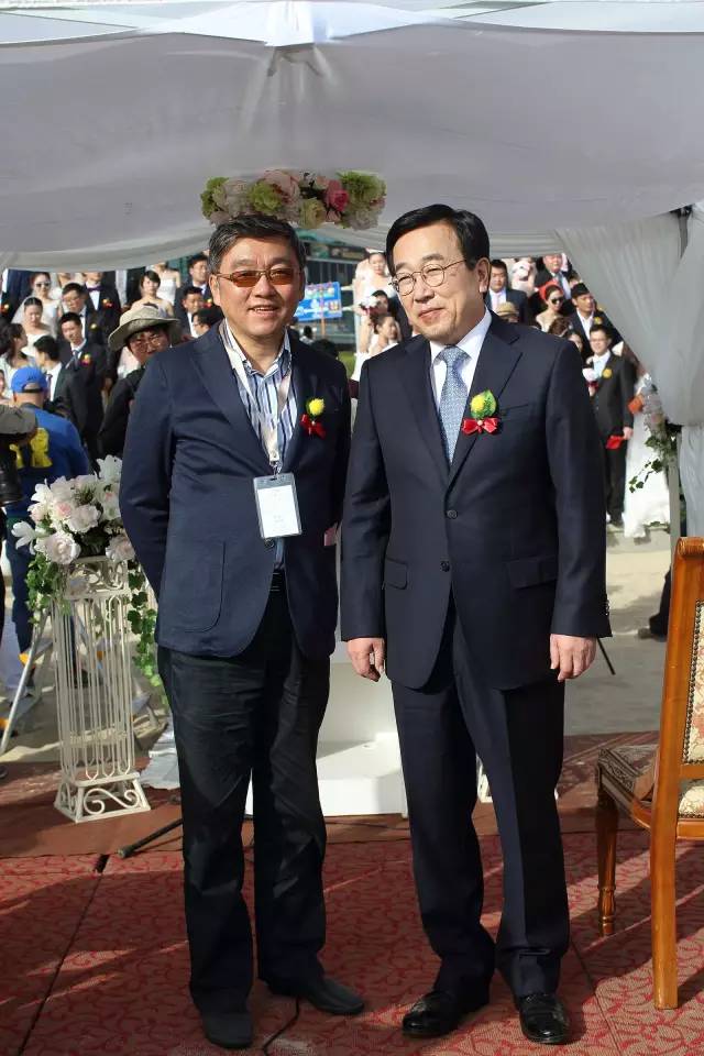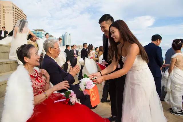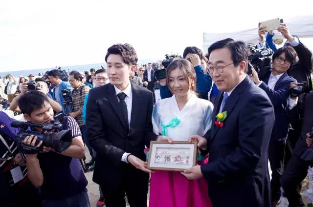 在随后的证婚仪式环节中,主办方设计有家庭、亲情关系这一环节的展现,来自浙江的一对新人父母,作为新人家长的代表在台上跟新人们说起了家常话,令人感到有些惊奇的是,现场还有一对老人,他们结婚是在上世纪的60年代,至今已有50年了,张序煦、贾兰珠作为中国的金婚夫妇代表,专程被邀请来釜山为新人们祝福,也希望新人们都有他们自己的金婚纪念日。