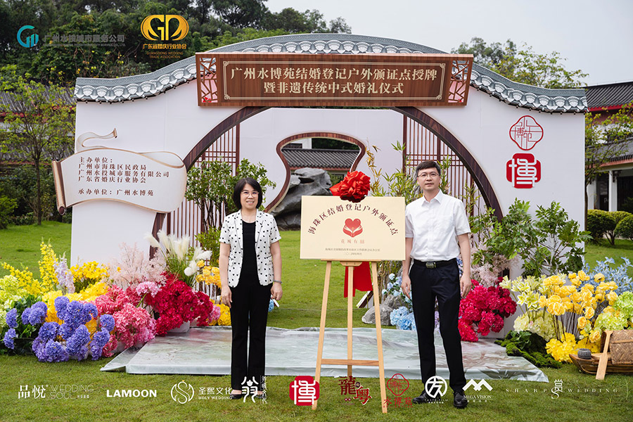 2024年5月9日,由广州市民政局指导,海珠区民政局、广东省婚庆行业协会、广州水投城市服务有限公司主办的结婚登记户外颁证点揭牌仪式在广州市海珠区标志性的绿色生态地标广州水博苑举行。这不仅标志着海珠区婚姻登记服务的一大步创新,也代表着该区文化与生态的进一步深度融合。