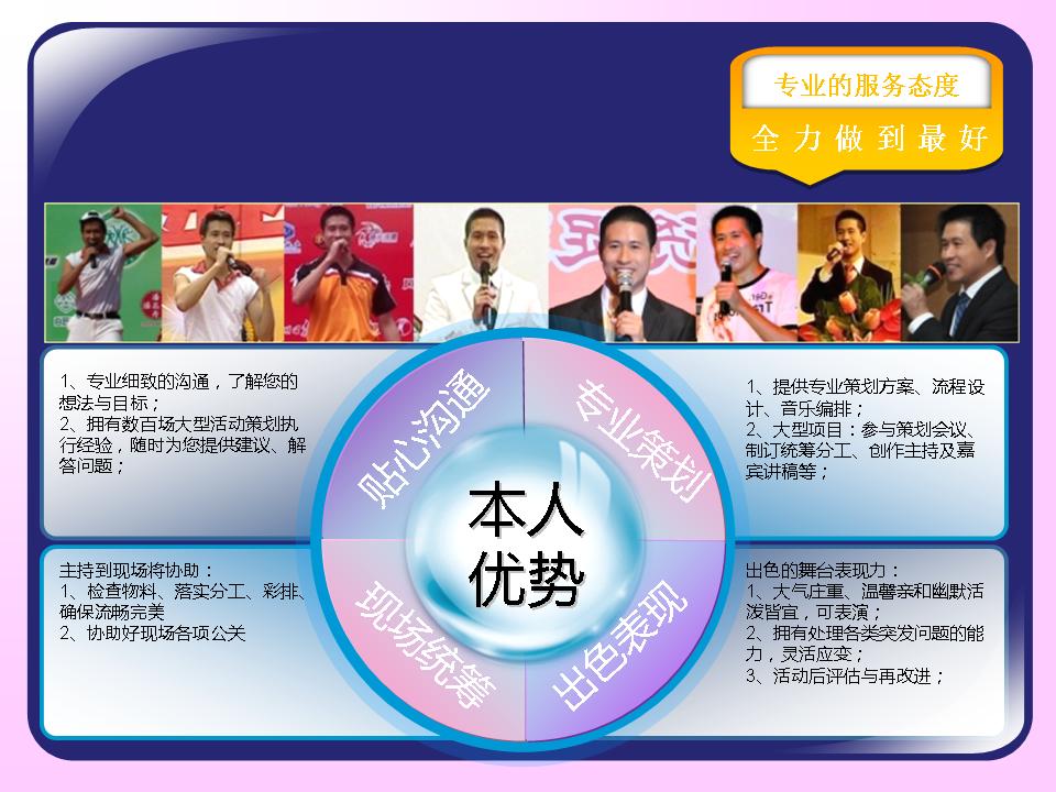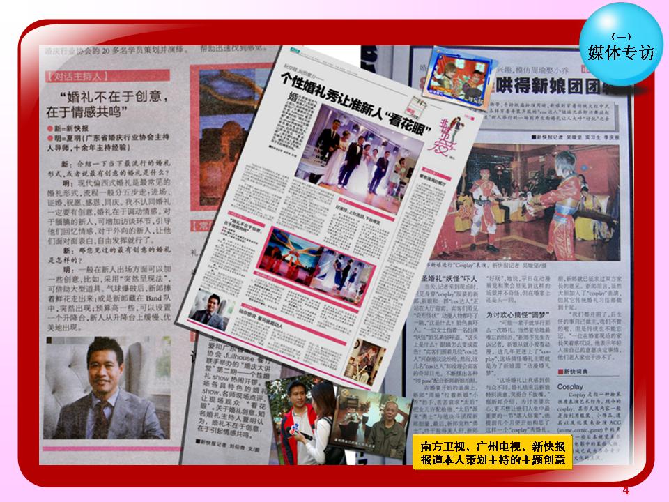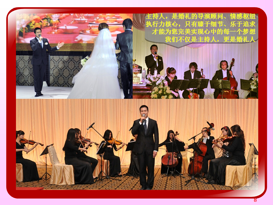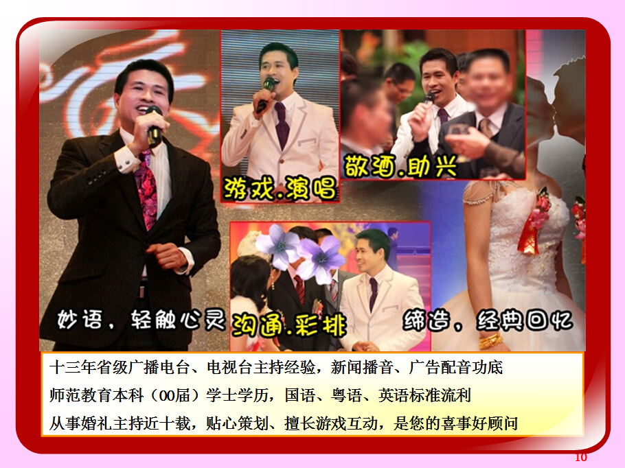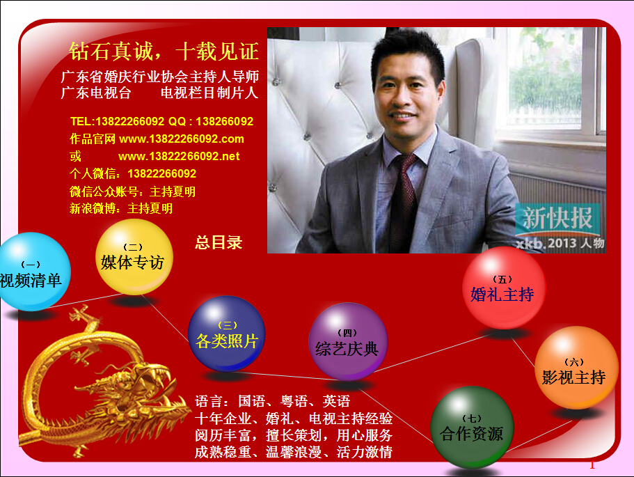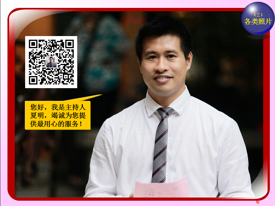 广东省婚庆行业协会主持人导师夏明,十余年广电传媒节目主持导演经验及婚礼主持策划导演经验。与时俱进、用心策划,不断为新人创作定制出各种别具特色的主题婚礼策划,培养组建出民俗婚礼执行团队、西式婚礼执行团队、灯光音响执行团队各十余人。微信及手机号13822266092;作品网站www.13822266092.com(.net也行) 用心策划,以情共鸣,无论婚礼、满月、生日、贺寿,主持夏明团队都能为你缔造独一无二的情感文化氛围。为爱而生,爱无止境。不论豪门盛宴,还是几桌的小聚会,只要有爱存在,我们都乐意付出。价值,在于真诚。 我们相信,任何宴会,都有独一无二的魅力。 我们坚持,专属的策划设计,只为你而存在。