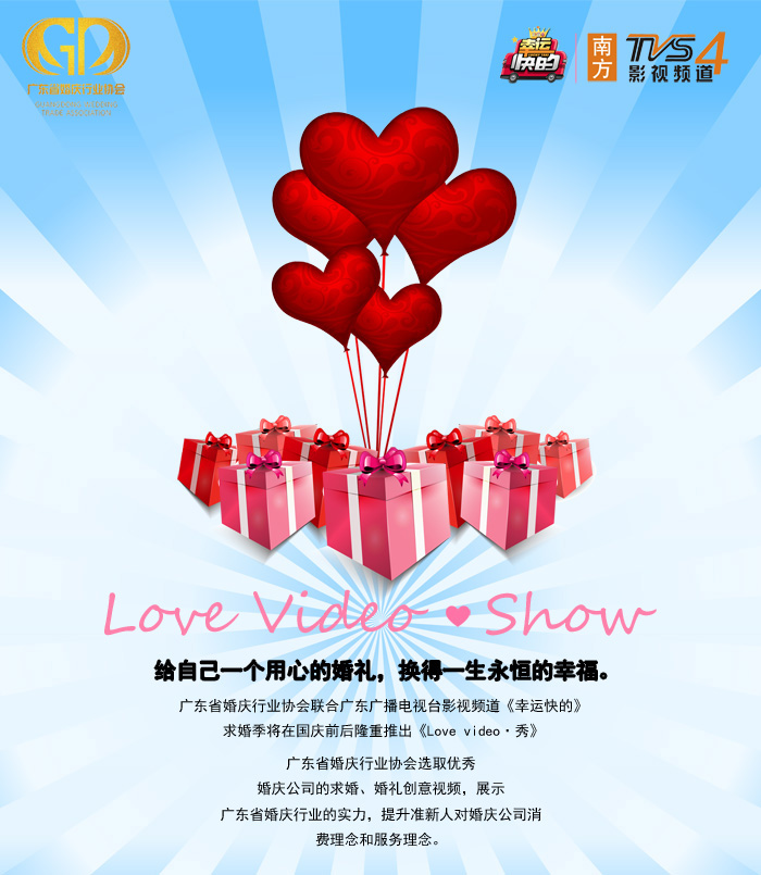广东省婚庆行业协会联合南方电视台影视频道《幸运快的》展播优秀婚礼创意视频,为准新人排忧解难。同时让更多新人了解岭南婚礼文化底蕴,提升广东省居民的婚庆观念,更好的了解婚庆市场。