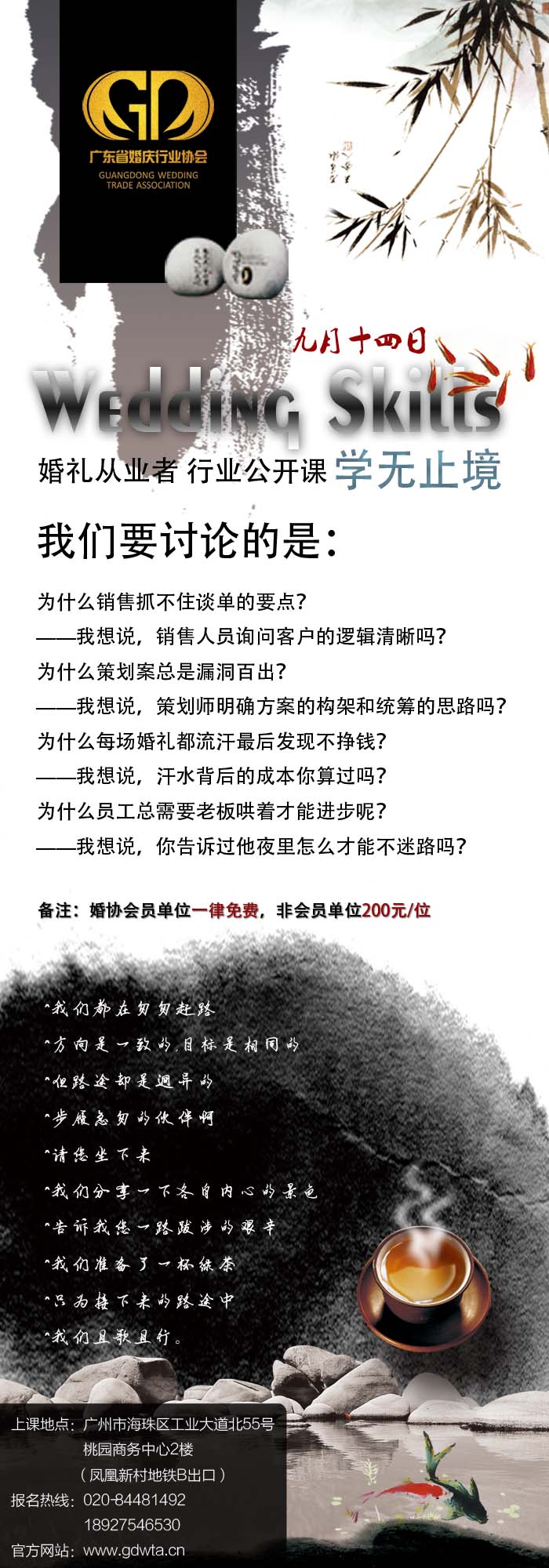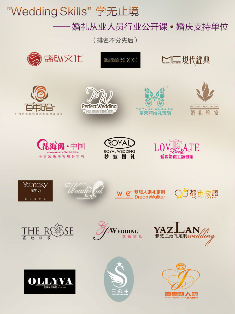 2014年9月14日,广东省婚庆行业协会在海珠区工业大道北55号桃园商务中心二楼举行婚礼从业人员行业公开课,广东省婚庆行业协会培训专业委员会主任王鑫通过如下五大主题做了深入浅出的演绎。