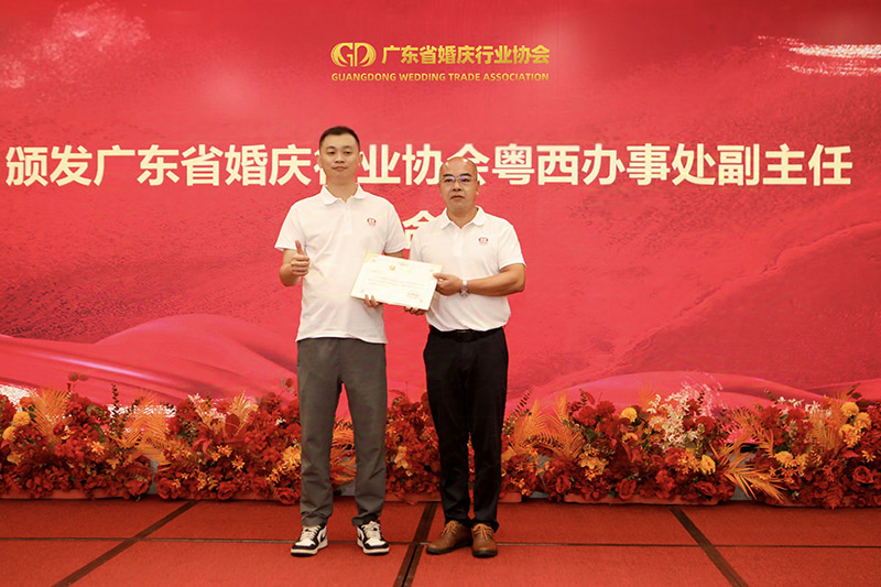 广东省婚庆行业协会监事林宏轩(右1)为粤西办事处简振聪主任(左1)颁发任命书